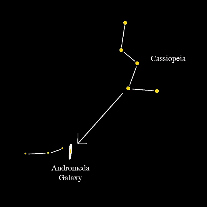 It’s easy to find in the sky, and worth going out during a new moon to check it out. Just use part of the “W” in Cassiopeia like an arrow to find it: